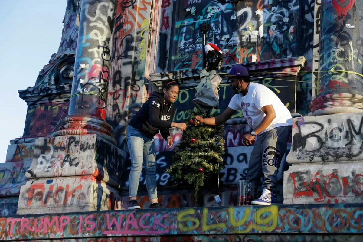 Autumn Nazeer (left) and Jason Cordon (right) on Dec. 13, 2020, decorate a Christmas tree placed on the base of the Gen. Robert E. Lee statue defaced with graffiti during Black Lives Matter protests in Richmond, Virginia. The statue was permanently removed in 2021. (Jacqueline Larma/Associated Press)