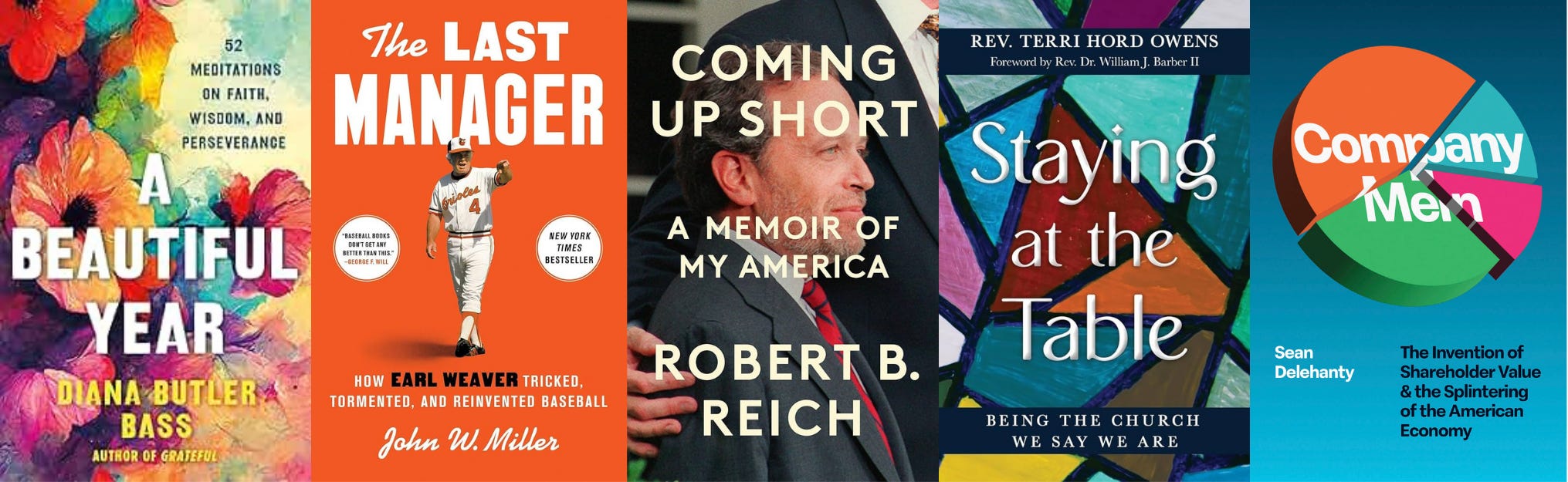 January: Money, Lies, and God by Katherine Stewart February: To Love Our Neighbors by Joe Blosser March: Disciples of White Jesus by Angela Denker April: Blessed Minds by Sarah Griffith Lund May: Pilgrim by Tony Campolo and Steve Rabey June: Accompanying Disability by Topher Endress July: The Anti-Greed Gospel by Malcolm Foley August: Rereading Revelation by Greg Carey September: The Bible According to Christian Nationalists by Brian Kaylor October: The Seven Mountains Mandate by Matthew Boedy November: Thriving Church by Erin Cash and Kory Wilcoxson & Holy Disruption by Amy Butler and Dawn Darwin Weaks