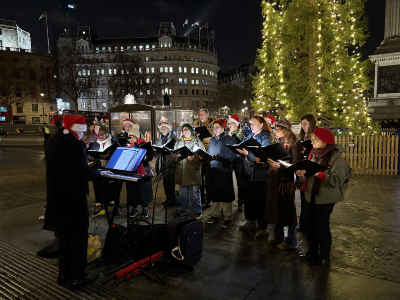 Christmas carolers perform in Trafalgar Square, Tuesday, Dec. 9, 2025, in London, England. (RNS photo/Yonat Shimron)