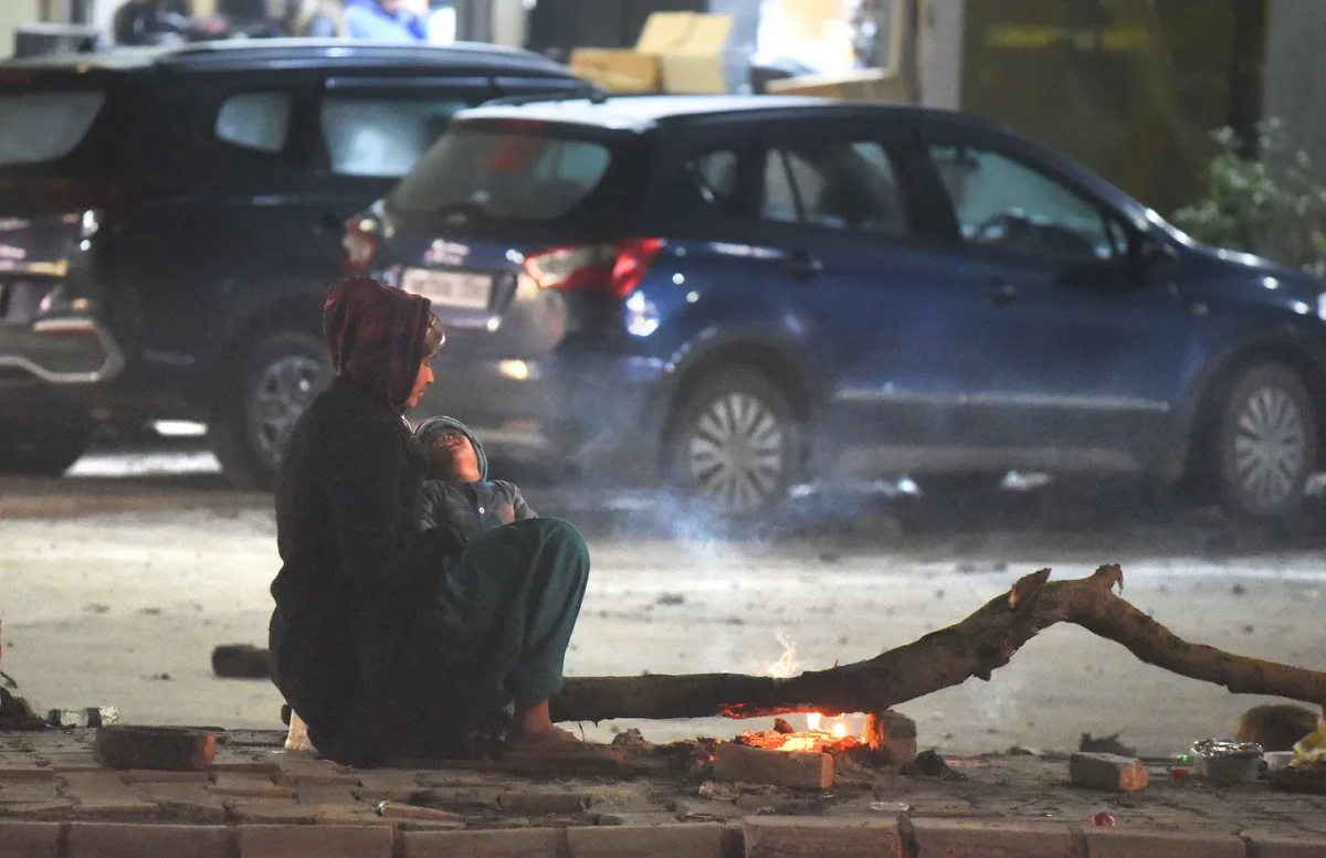 An unhoused woman warms herself and her child by a fire on a cold winter evening in Gurugram, India, on Dec. 30, 2024. (Parveen Kumar/Sipa USA/Alamy)