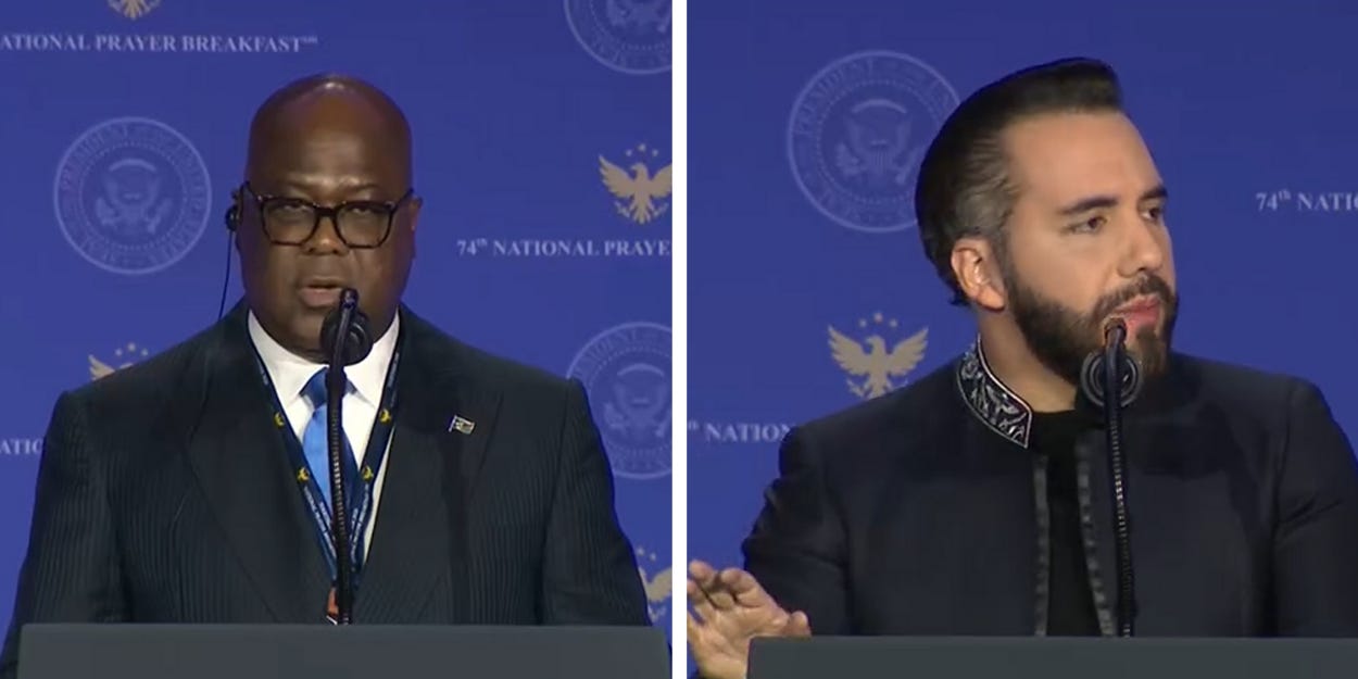 Screengrabs as President Felix Tshisekedi of the Democratic Republic of the Congo (left) and President Nayib Bukele of El Salvador (right) speak at the National Prayer Breakfast in Washington, D.C., on Feb. 5, 2026.