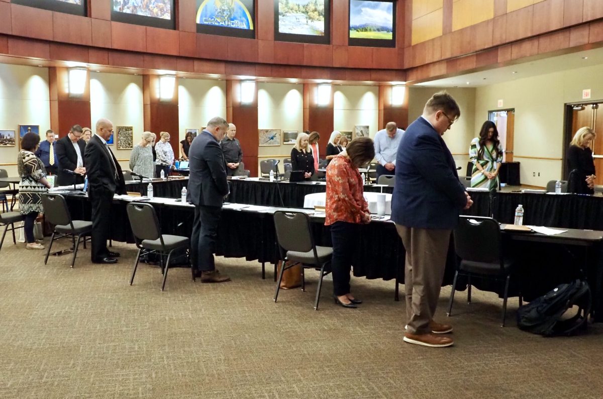 The Oklahoma Statewide Charter School Board members and staff pray at the beginning of a meeting Sept. 9, 2024, at the Oklahoma History Center in Oklahoma City. (Photo by Nuria Martinez-Keel/Oklahoma Voice)