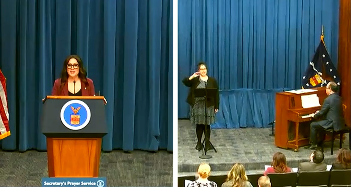 Screengrabs during a Department of Labor worship service as Secretary Lori Chavez-DeRemer speaks (speaks) and employees lead singing (right) in Washington, D.C., on Feb. 11, 2026.