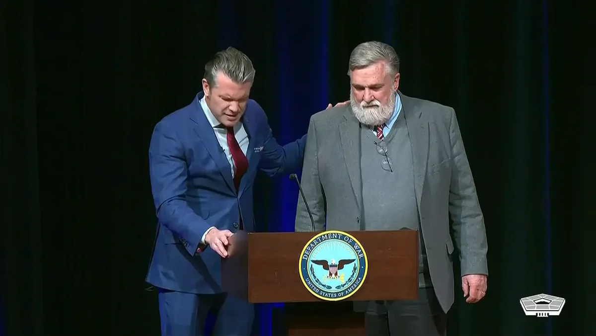 Screengrab of Pete Hegseth (left) standing next to Doug Wilson while leading a prayer during a worship service at the Pentagon on Feb. 17, 2026.