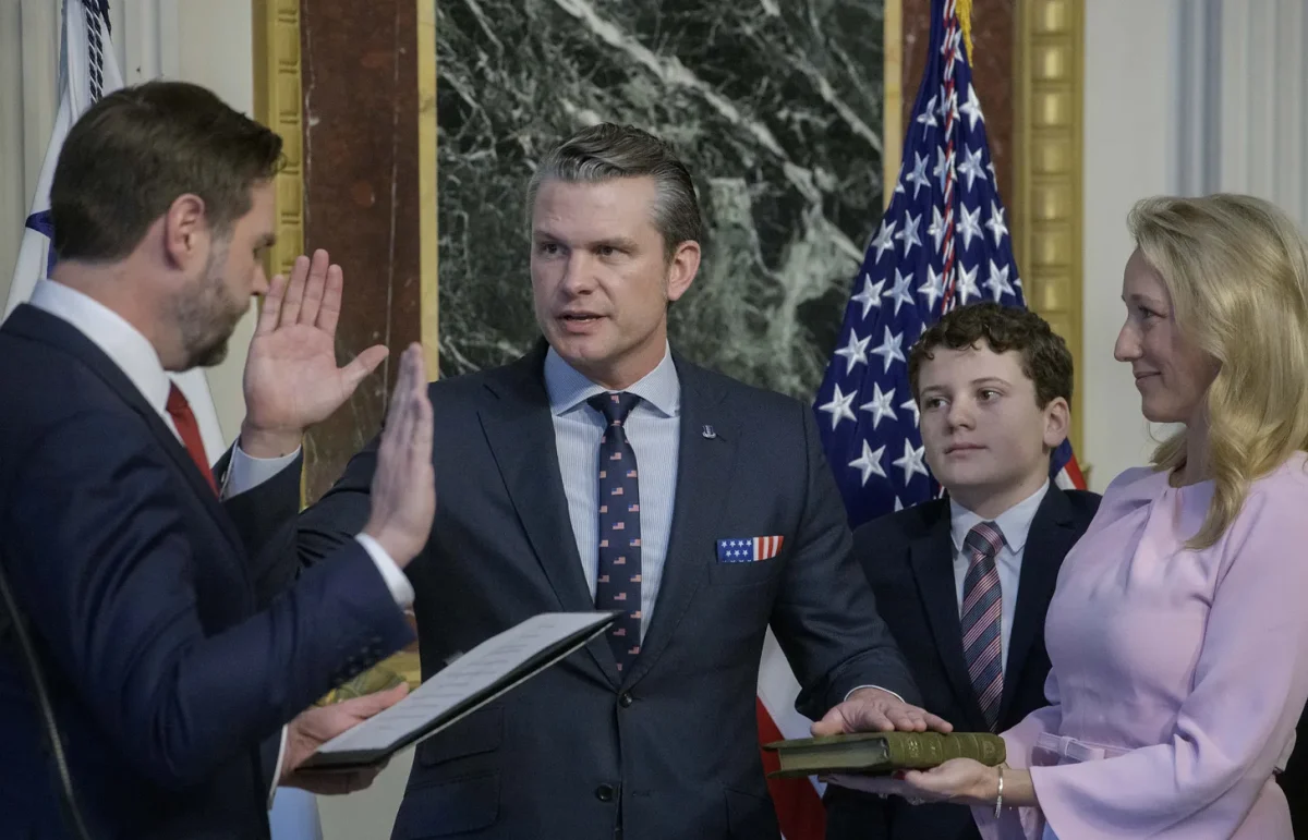 Pete Hegseth (center) takes the oath of office as secretary of defense on Jan. 25, 2025, as his wife Jennifer holds his Bible. In another image from the ceremony, she tilts the Bible enough that the Jerusalem Cross is slightly visible. (Rod Lamkey Jr./Associated Press)