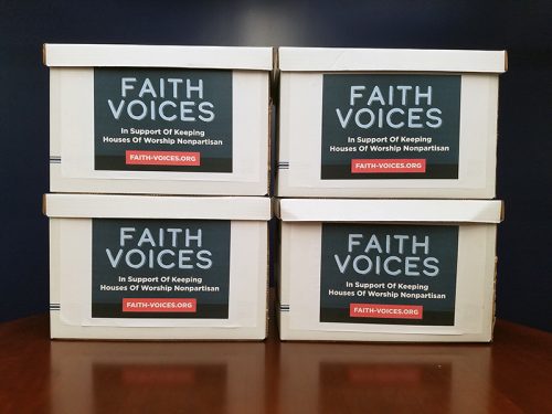 Boxes of letters from clergy who are opposed to repealing the Johnson Amendment, a federal law that bars tax-exempt houses of worship from engaging in partisan politicking, prior to delivery on Capitol Hill. Photo courtesy of Americans United