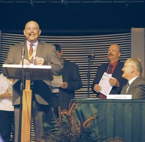 |    			Resolutions Committee Chair Ron Foley leads in the presentation of seven resolutions to MBC messengers. Seated at right is Parliamentarian Duane Benton. Standing behind him is committee member Nathan Argent. 			 |