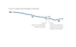 The study finds 62% of U.S. adults call themselves Christians. While a significant dip from 78% in 2007, Pew found the Christian share of the population has remained relatively stable since 2019.